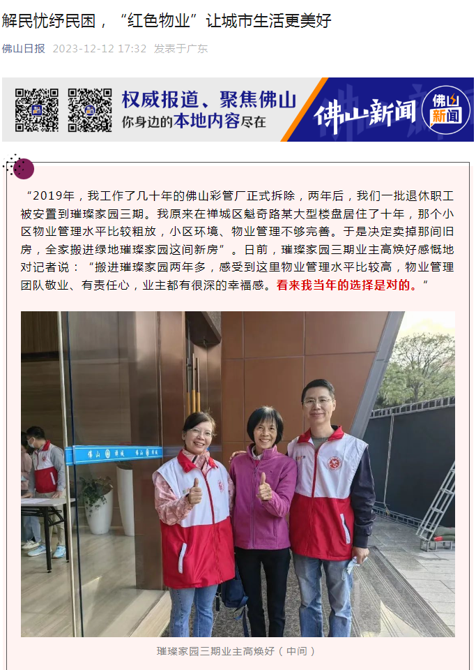 佛山日報在文章中對(duì)安邦物業及璀璨家園項目進(jìn)行了介紹,重點結合記者實地走訪,從社區環境治理、長(cháng)者關愛、便民服務措施等多個維度詳細展示了璀璨家園紅色物業治理措施。文章指出:黨建引領鑄就(jiù)幸福和諧“紅色物業”,有擔當的“紅色物業”竭誠爲業主排憂解難,物業公司、業主齊心協力打造“有溫度”的幸福生活!