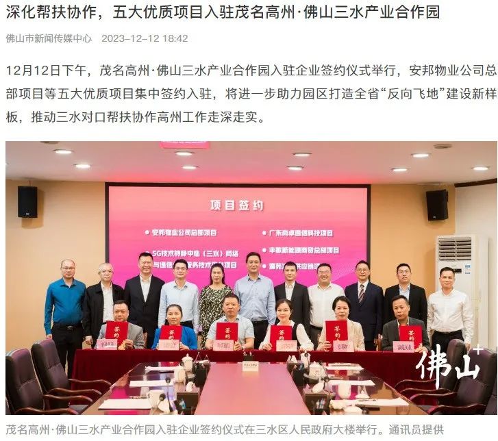 自安邦集團2017年成(chéng)爲佛山市市屬控股國(guó)有企業以來,無論是在本地的市場發(fā)展,還(hái)是外部的企業競争,佛山市各級單位和領導均給予大力支持,讓安邦集團近幾年的發(fā)展持續穩定向(xiàng)上。昨天,在茂名高州·佛山三水産業合作園入駐企業簽約儀式上,“佛山+”對(duì)安邦物業等五大優質項目集中簽約入駐進(jìn)行報道(dào)。