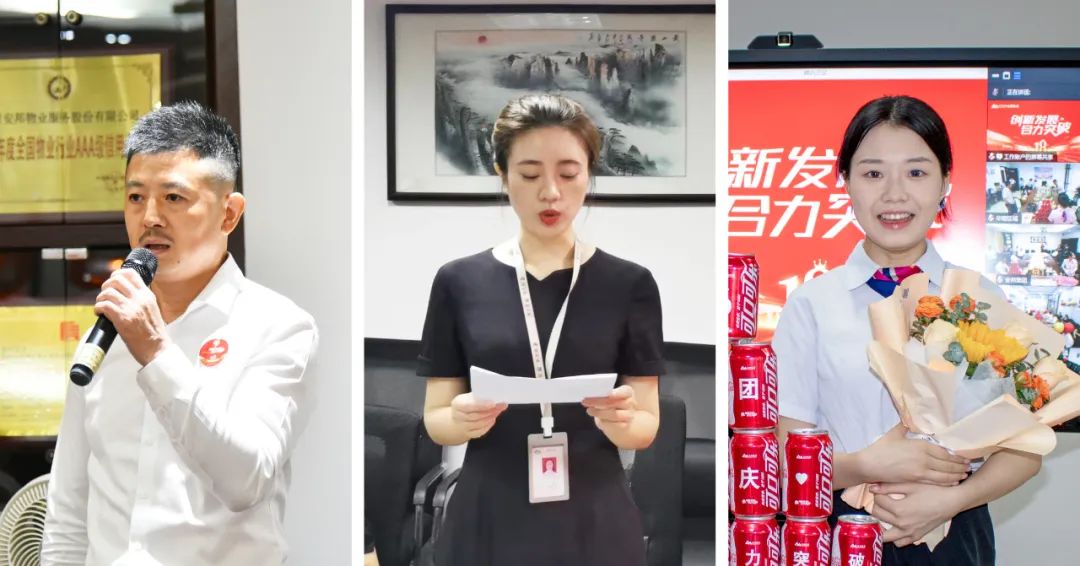 祝福視頻播放結束後(hòu),來自君地商務廣場項目經(jīng)理楊天華、重慶分公司計劃财務部李琴、璀璨廣場項目客服管家成(chéng)琳三名員工代表分别發(fā)言并緻以安邦美好(hǎo)的祝福。