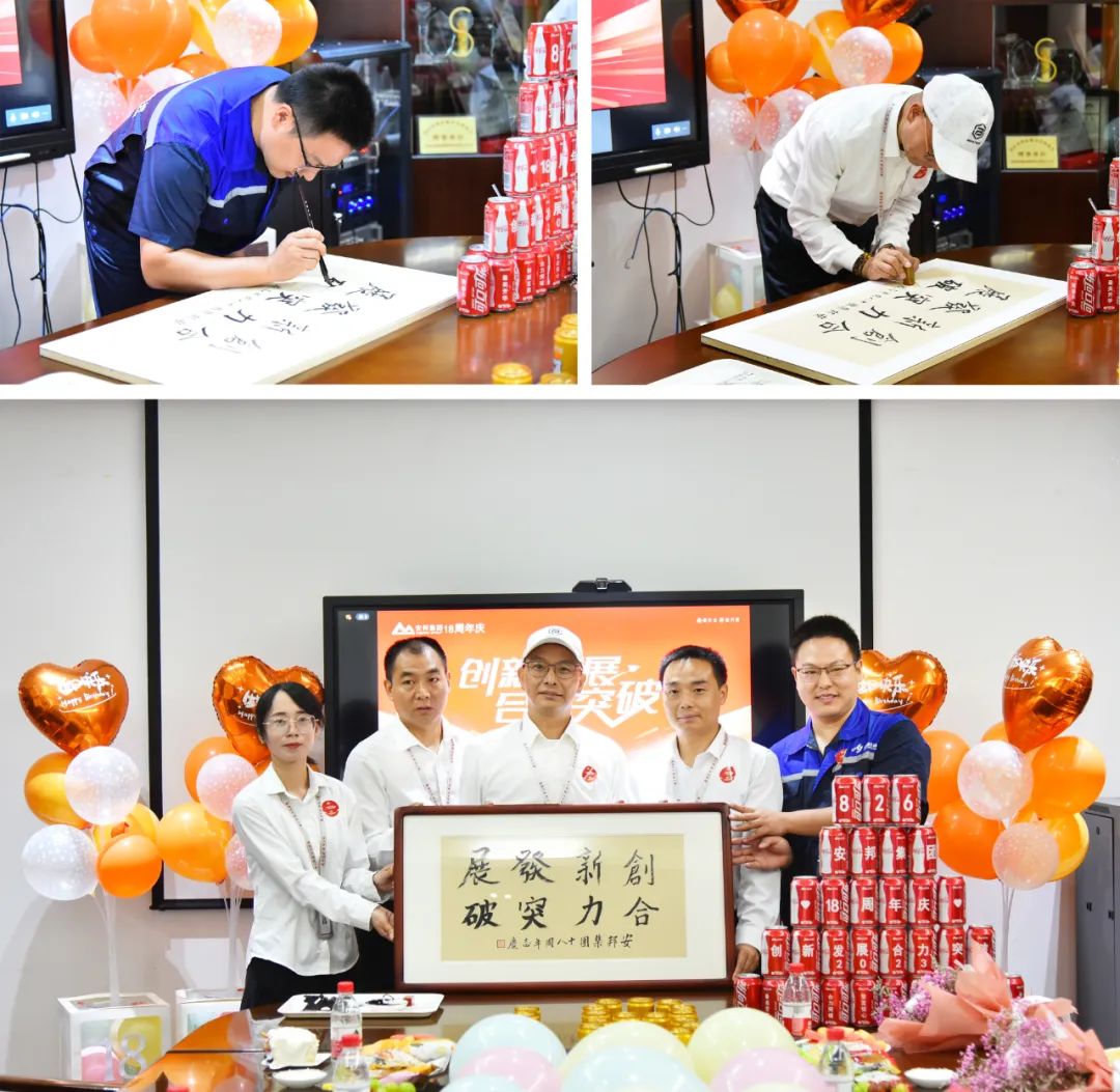在大家分享蛋糕的同時(shí),4位入職同事(shì)和壽星分别揮毫潑墨,共同書寫“創新發(fā)展,合力突破”,感受安邦深厚底蘊的企業文化魅力。周董親自爲題詞落印。