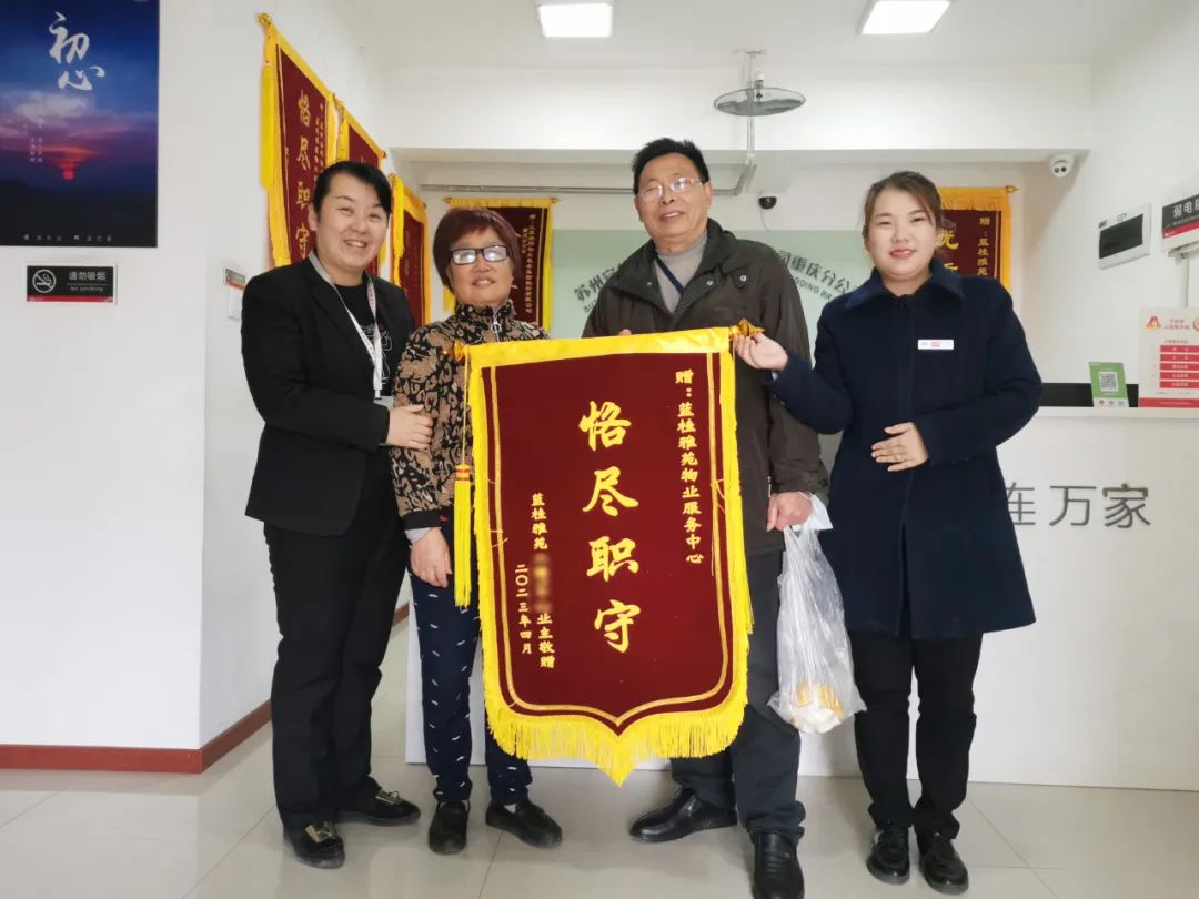 西南區域藍桂雅苑客服尹庭平時(shí)熱心幫助業主,獲得業主高度認可。2幢業主親自將(jiāng)一面(miàn)印著(zhe)“恪盡職守”的錦旗送到物業,表達感激之情。