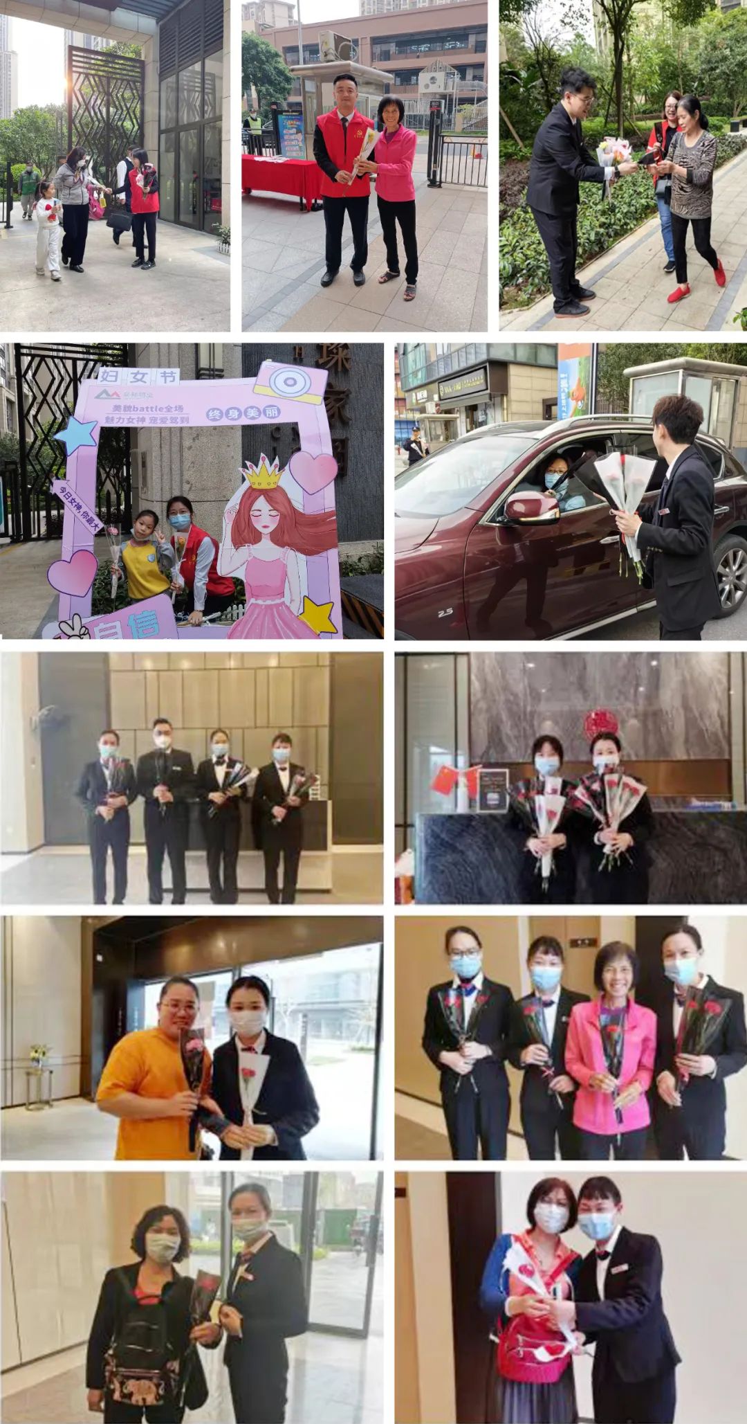 春風十裡(lǐ),芳華如你。爲表達對(duì)女性業主的祝福與關愛,2023年3月8日早晨,安邦物業華南區域各項目工作人員以及公司黨員志願者們早早來到小區出入口擔當“送花使者”,爲每一位進(jìn)出的女神送上誠摯的祝福。