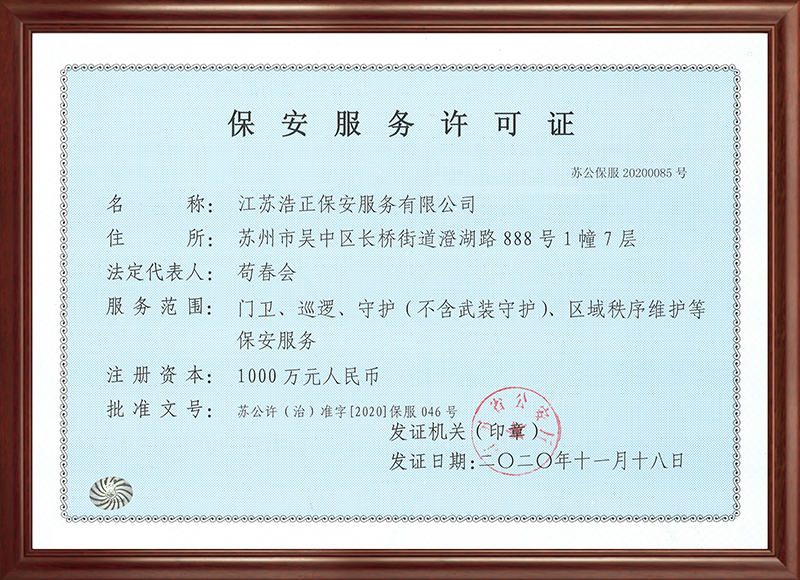 江蘇浩正保安服務有限公司爲安邦集團旗下全資子公司,注冊資金1000萬元,2020年獲得江蘇省公安廳頒發(fā)的《保安服務許可證》。
